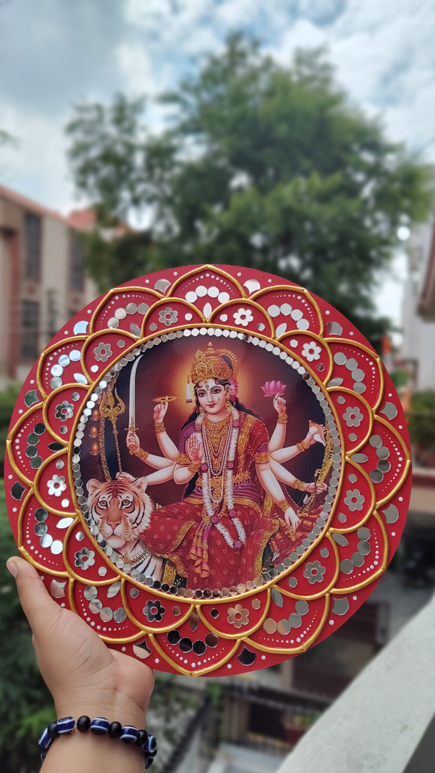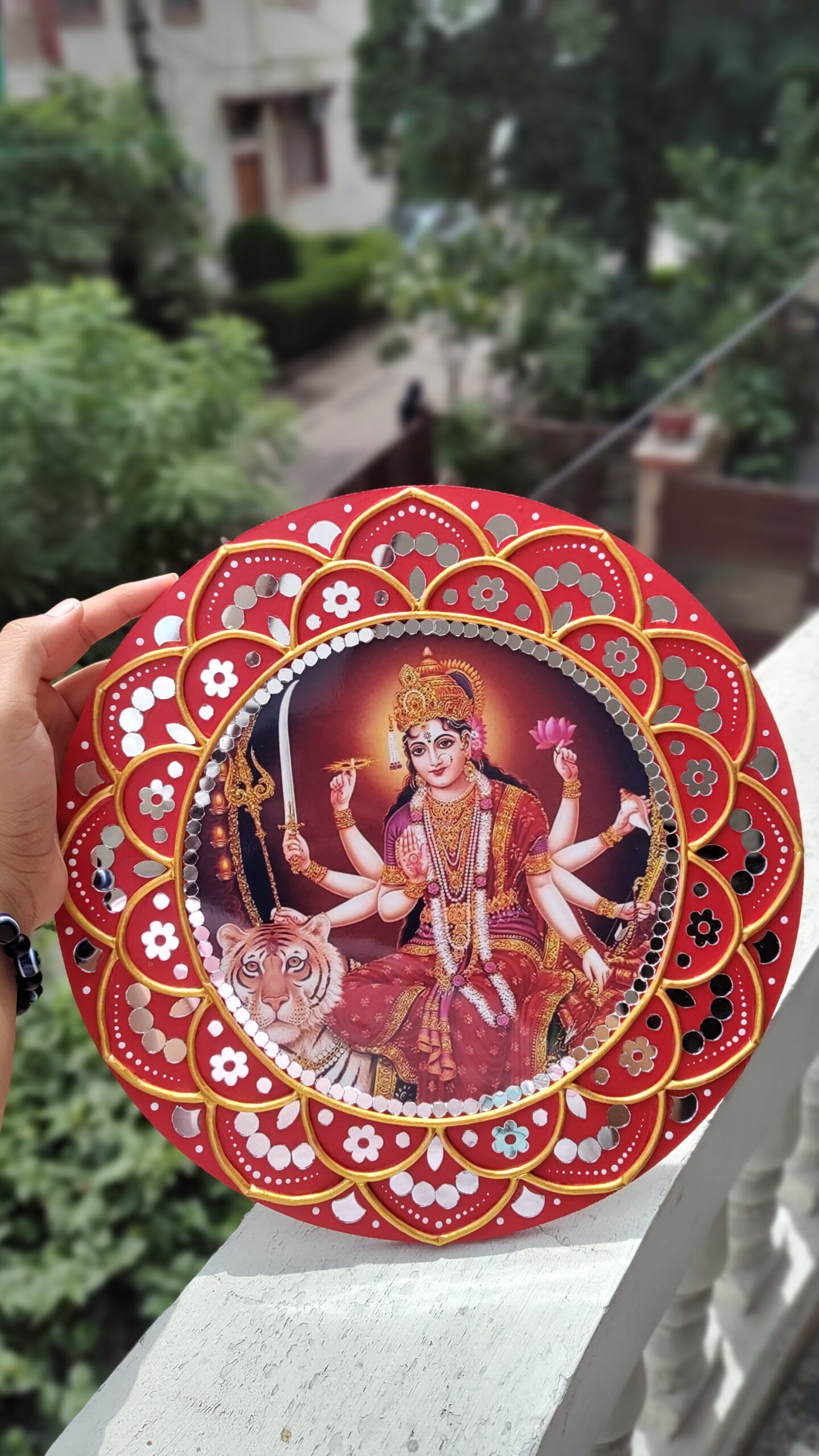 At the centre is a powerful image of Durga Maa, radiating strength, protection, and positivity. Surrounding her is a stunning handcrafted frame designed in a modern lippan art style, made with clay instead of mud & adorned with delicate mirror work and acrylic colors. The lotus-petal pattern around the photo adds depth and charm, making it a standout piece on any wall.