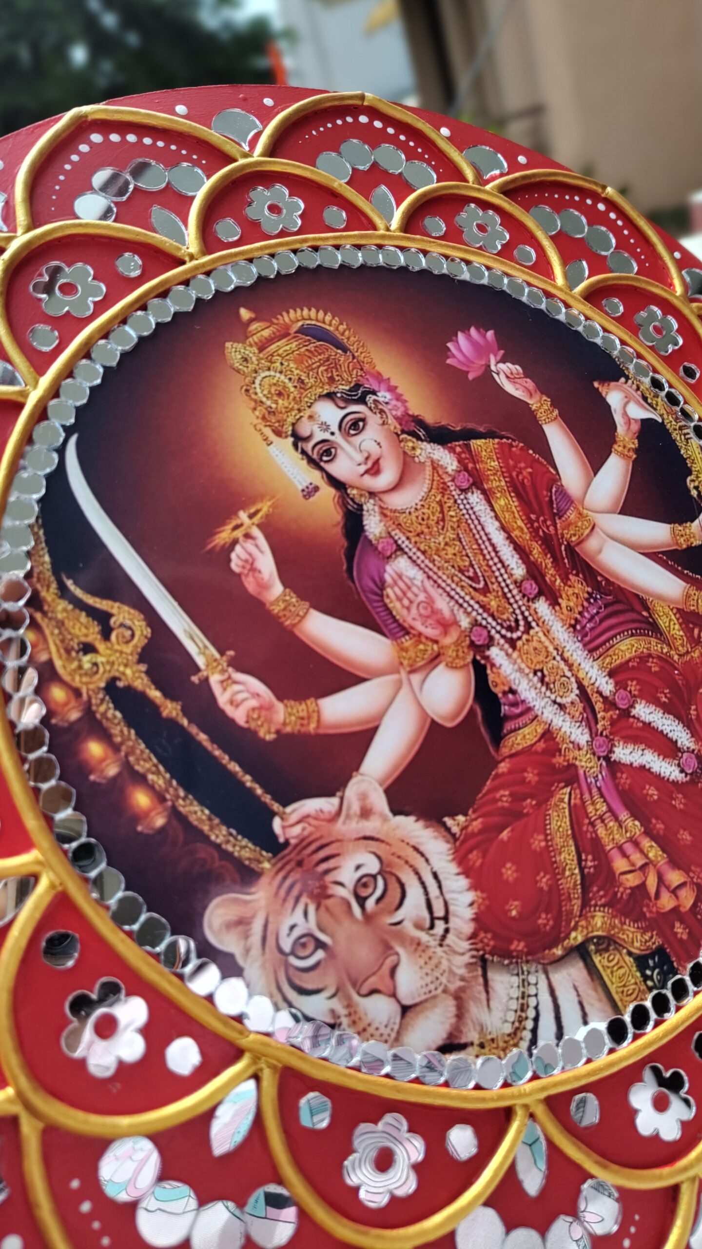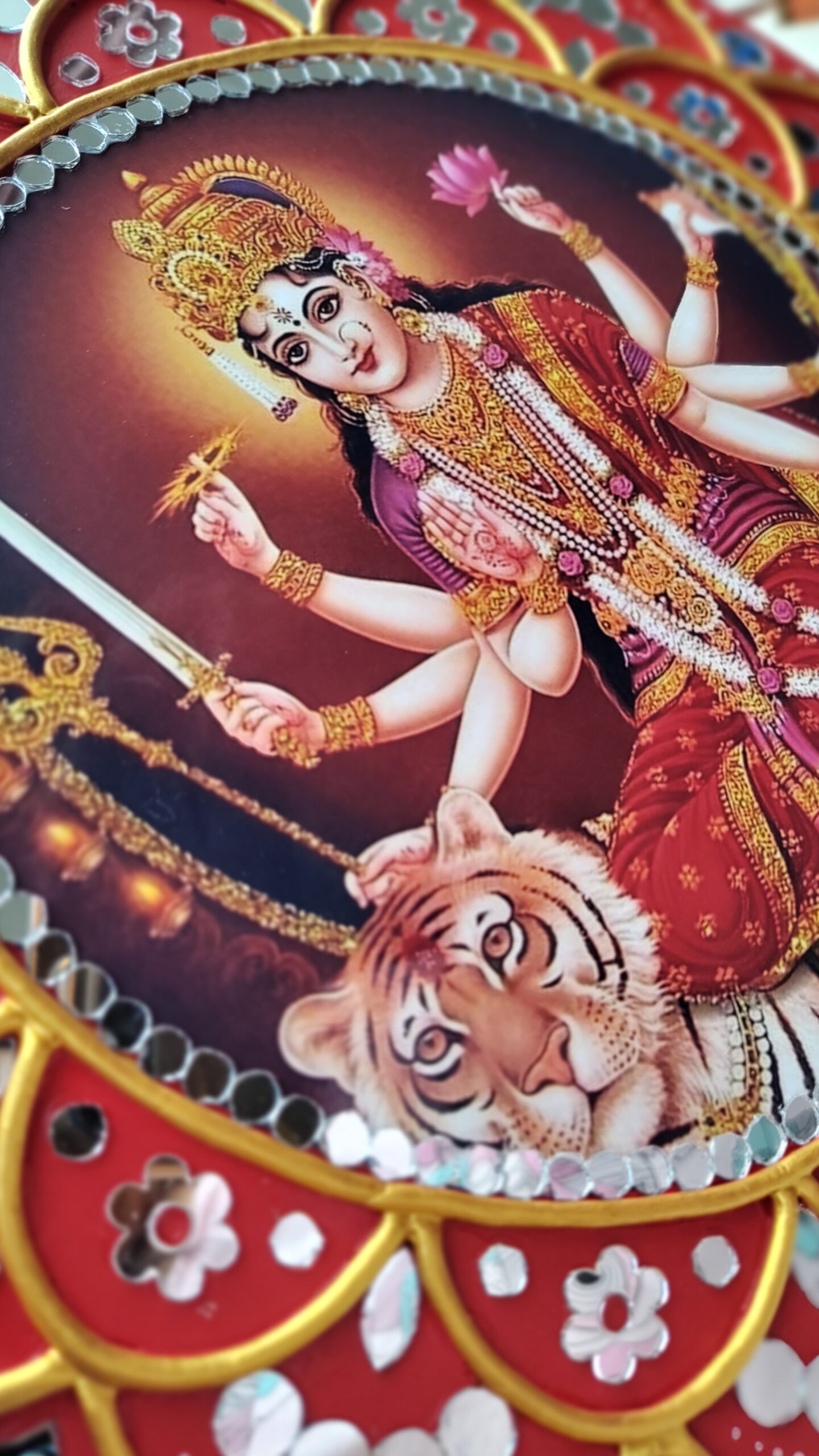 • Features Durga Maa photo in the centre with a lotus-style floral frame.