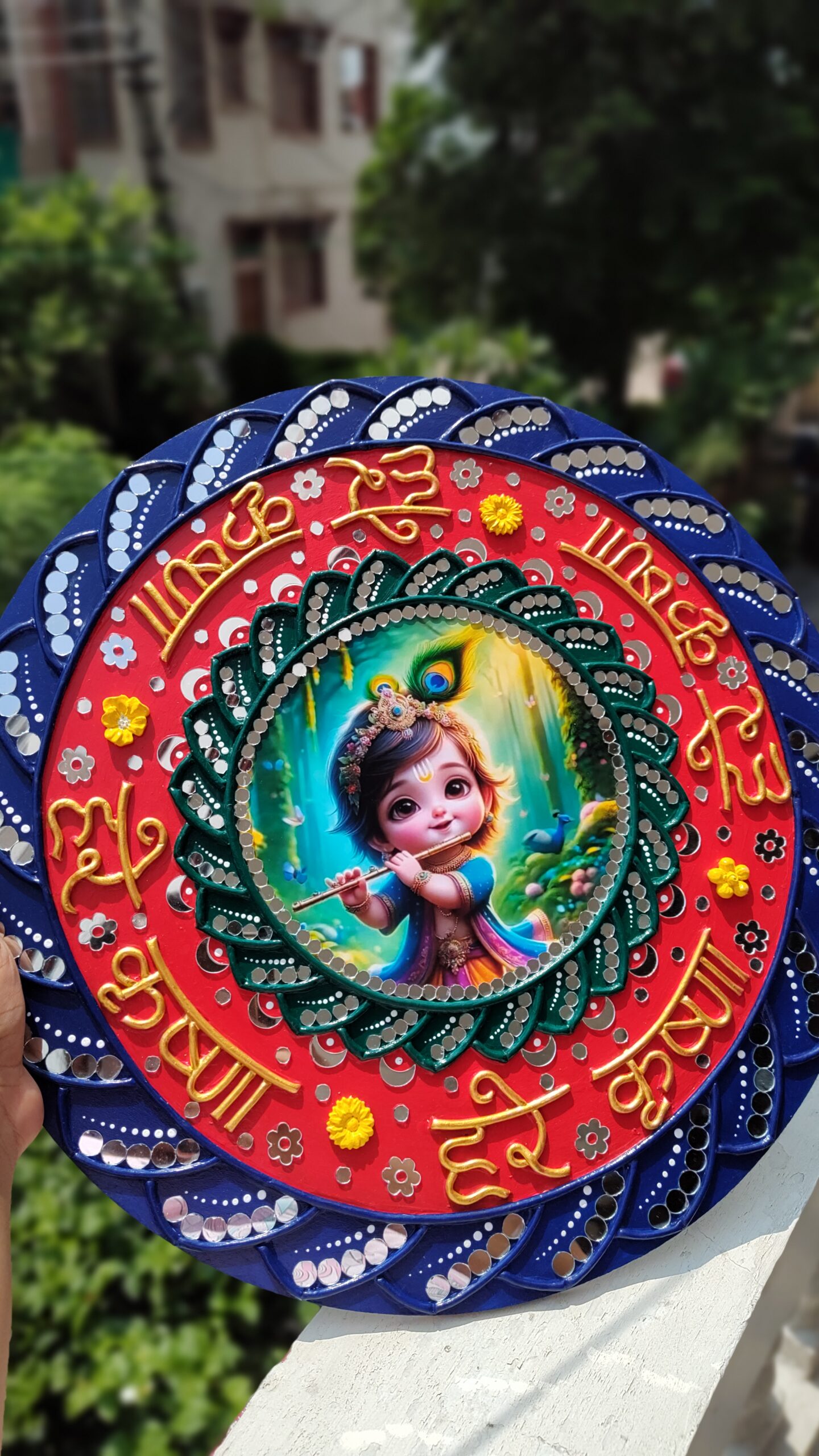 • Adorns the beautiful Krishna Photo in the centre. Moreover, the sacred words “Hare Krishna” in the artwork adds a spiritual charm.