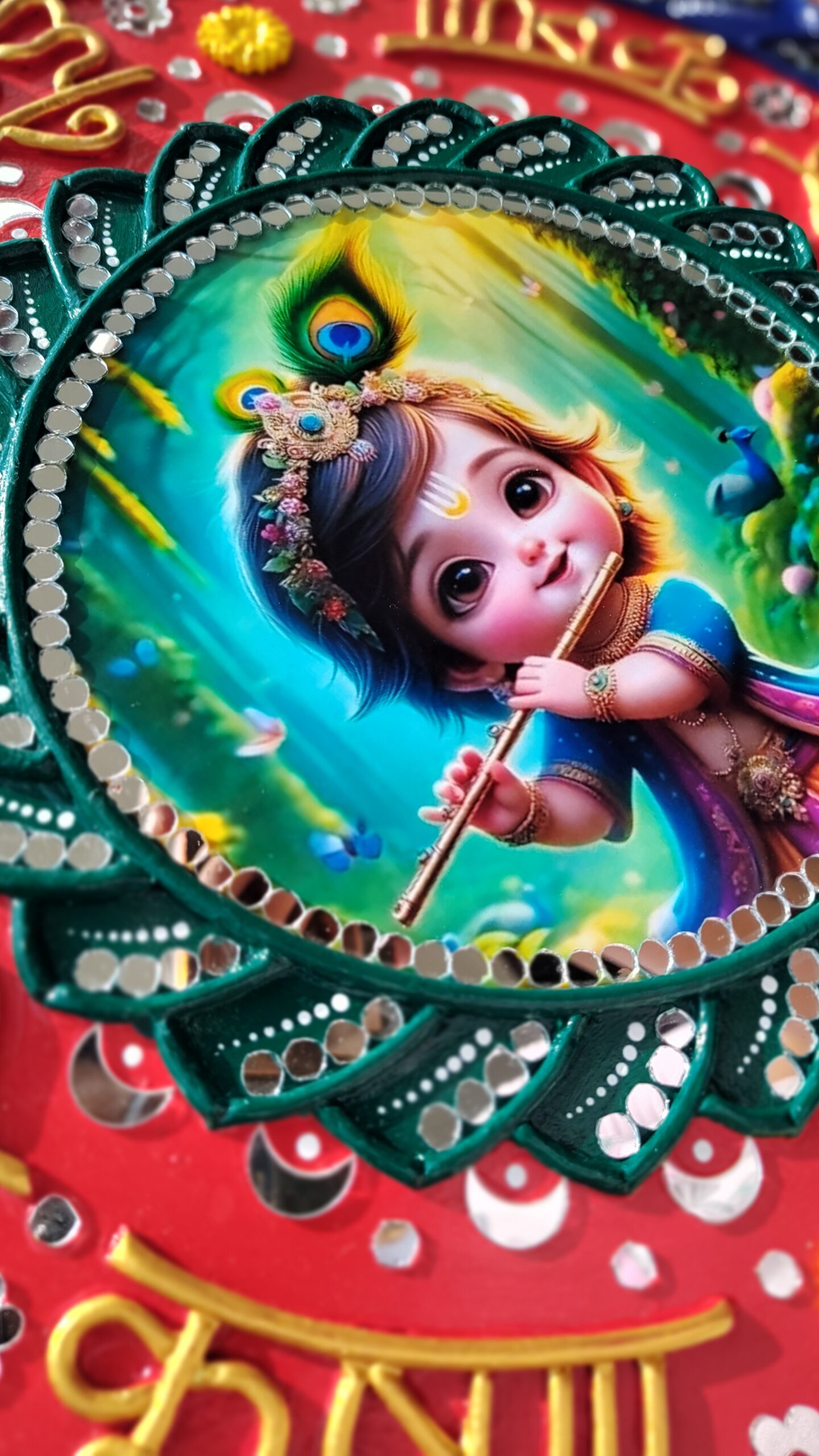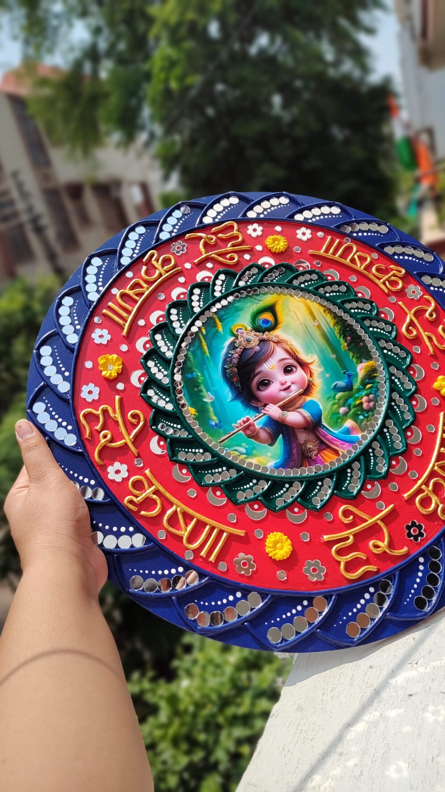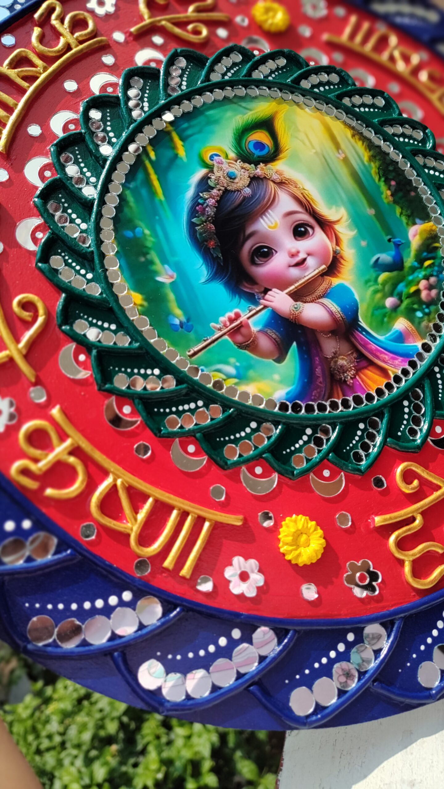 Each detail is shaped with clay, painted in vibrant acrylics, and finished with intricate mirror work.