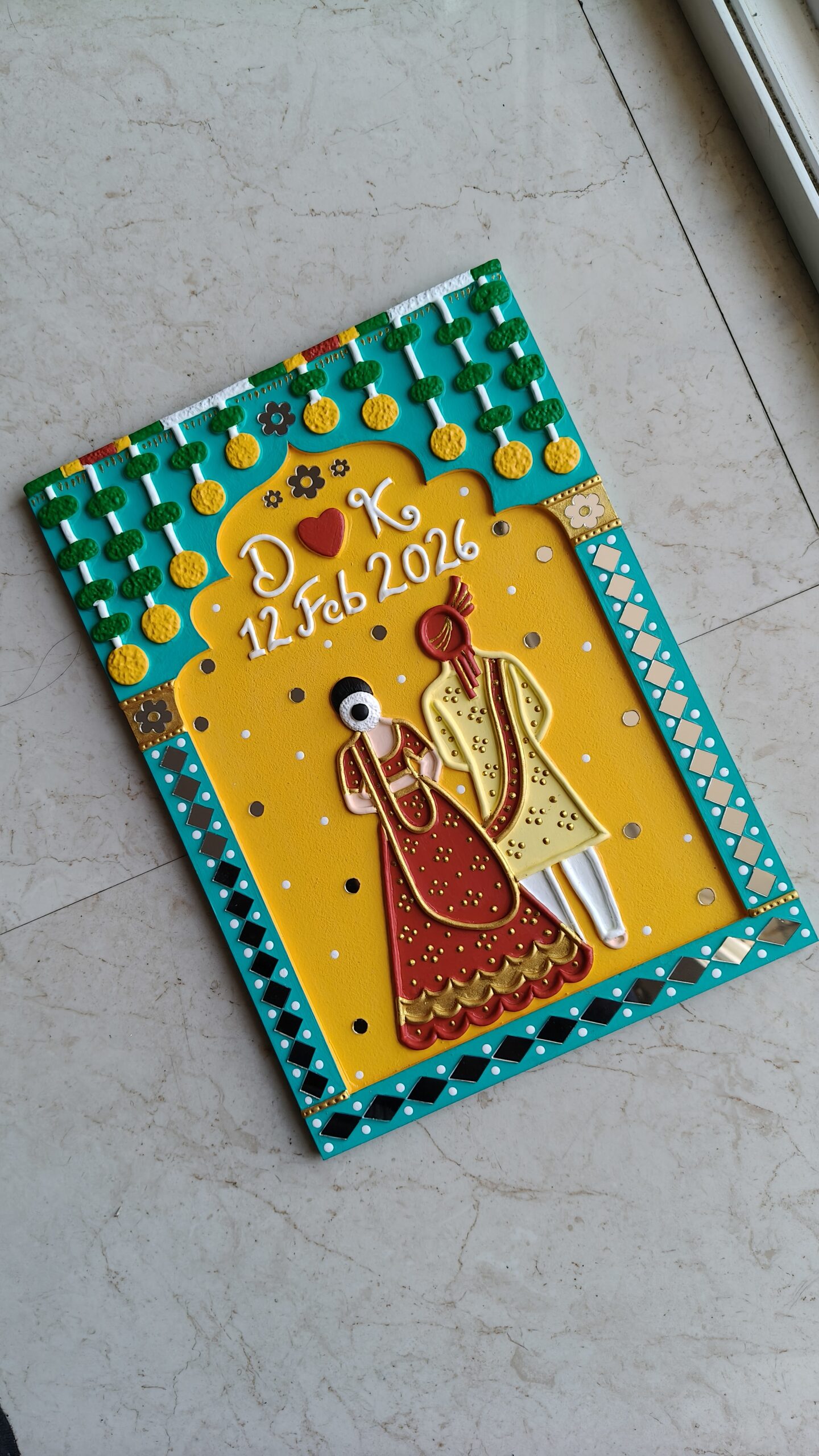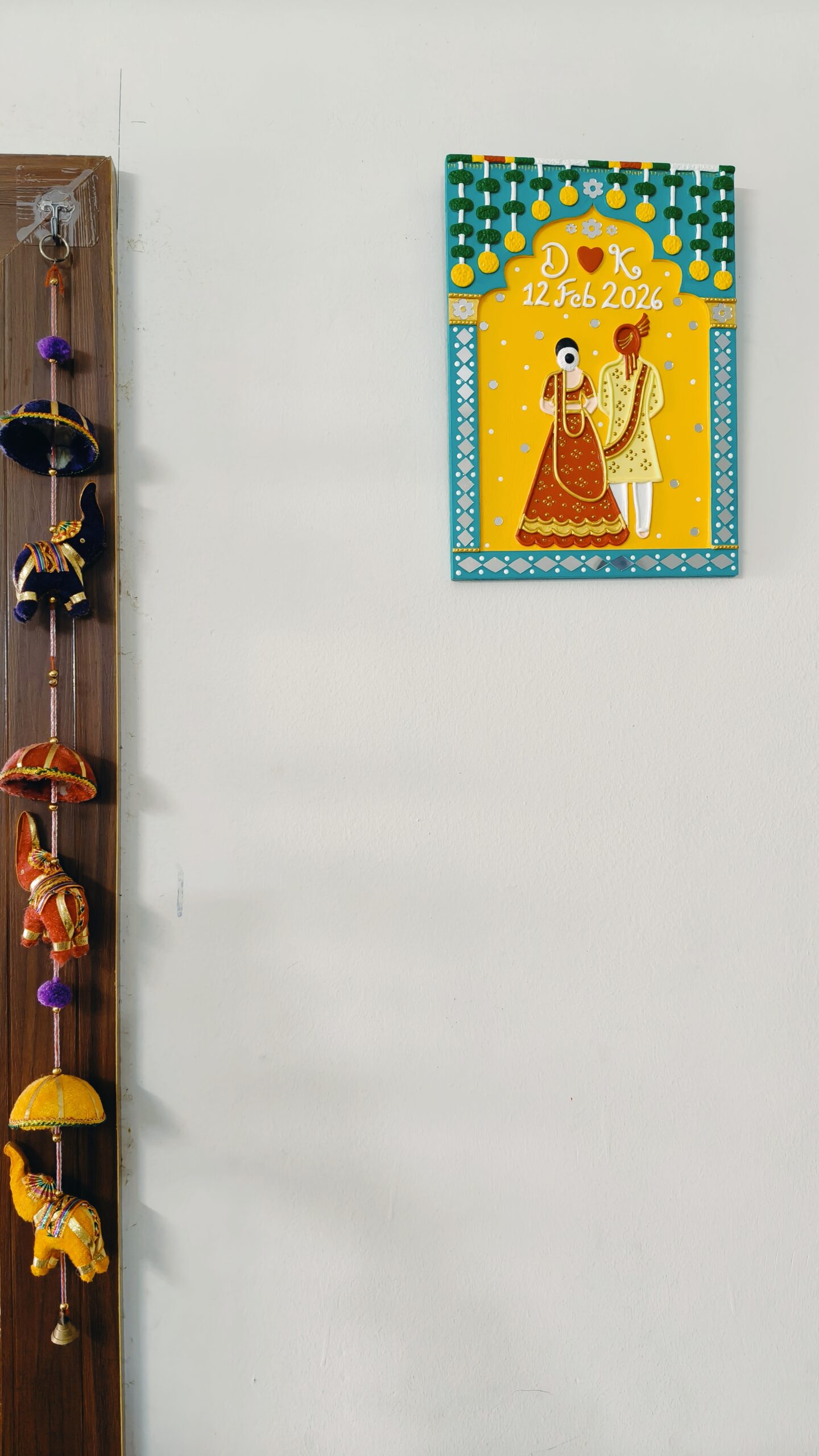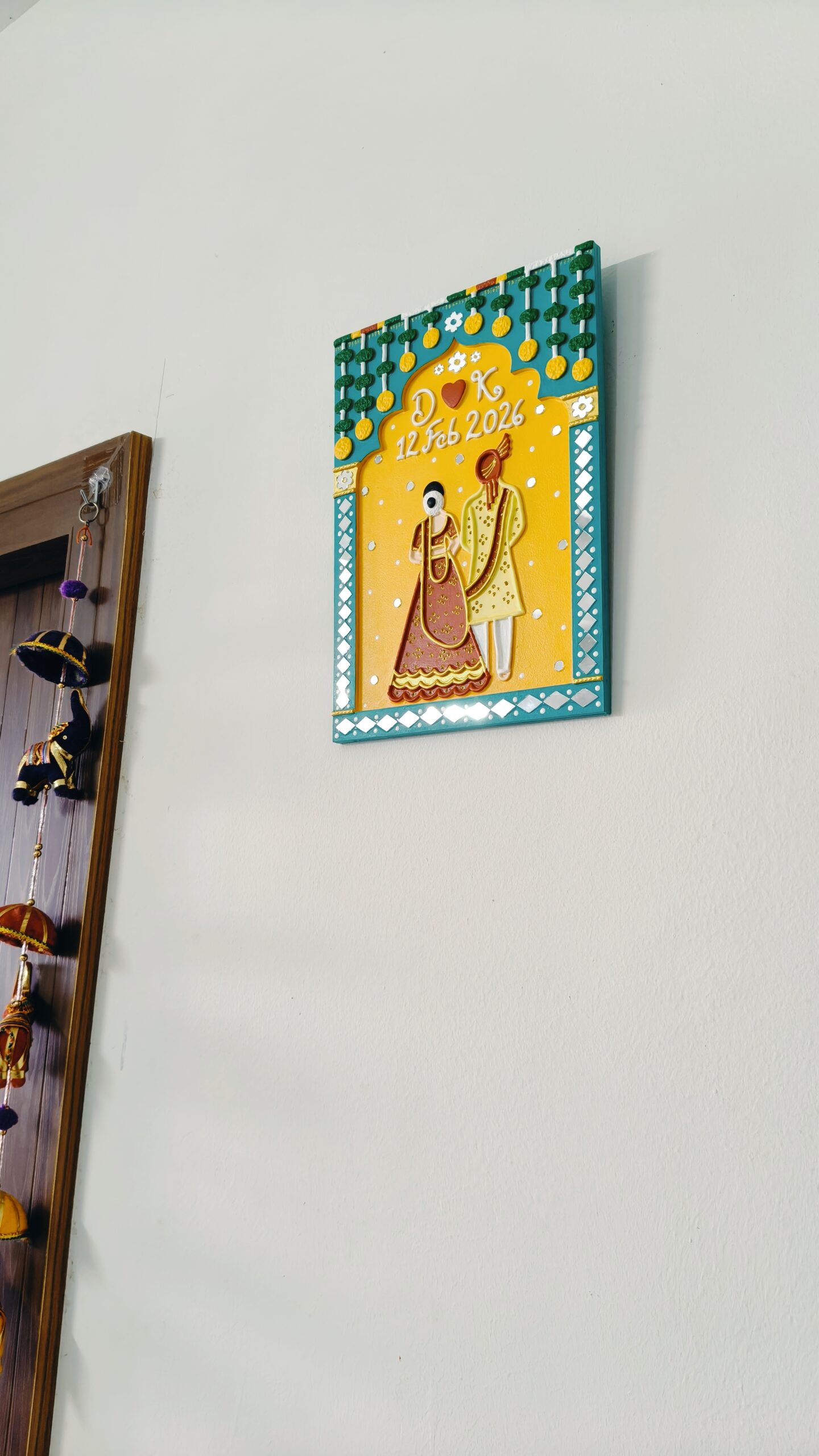 Designed with a bride and groom figure, name initials, and wedding date, this piece brings warmth, colour, and meaning to any space. It blends traditional Indian design with a modern handmade finish, making it perfect for today’s homes.