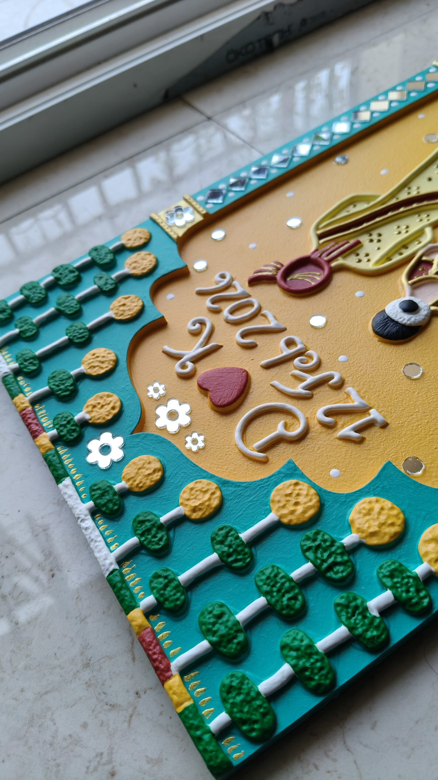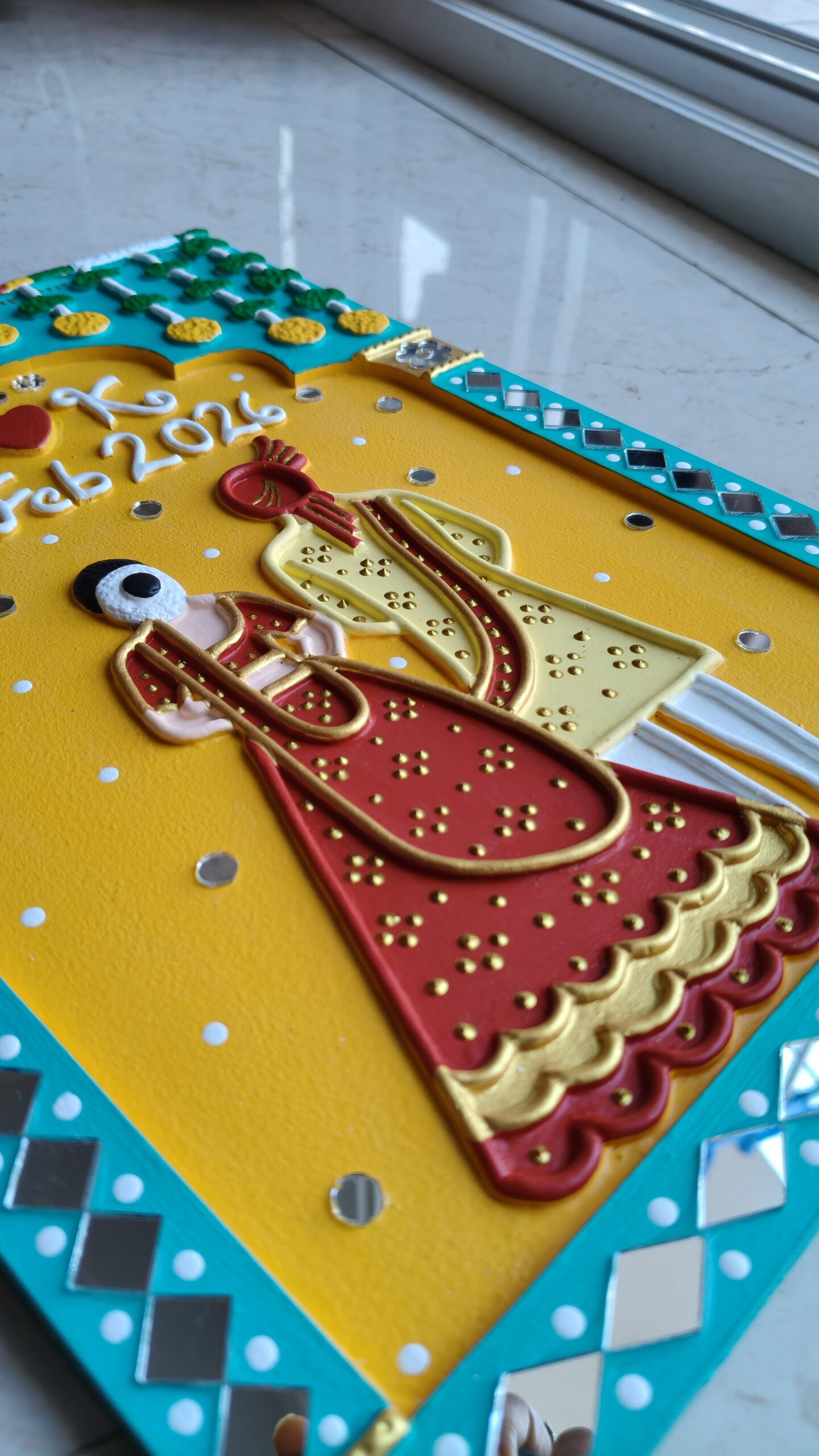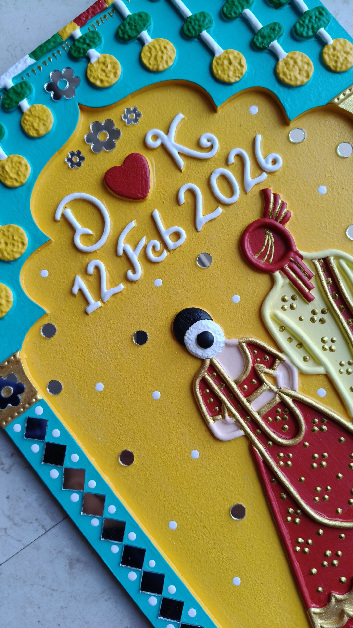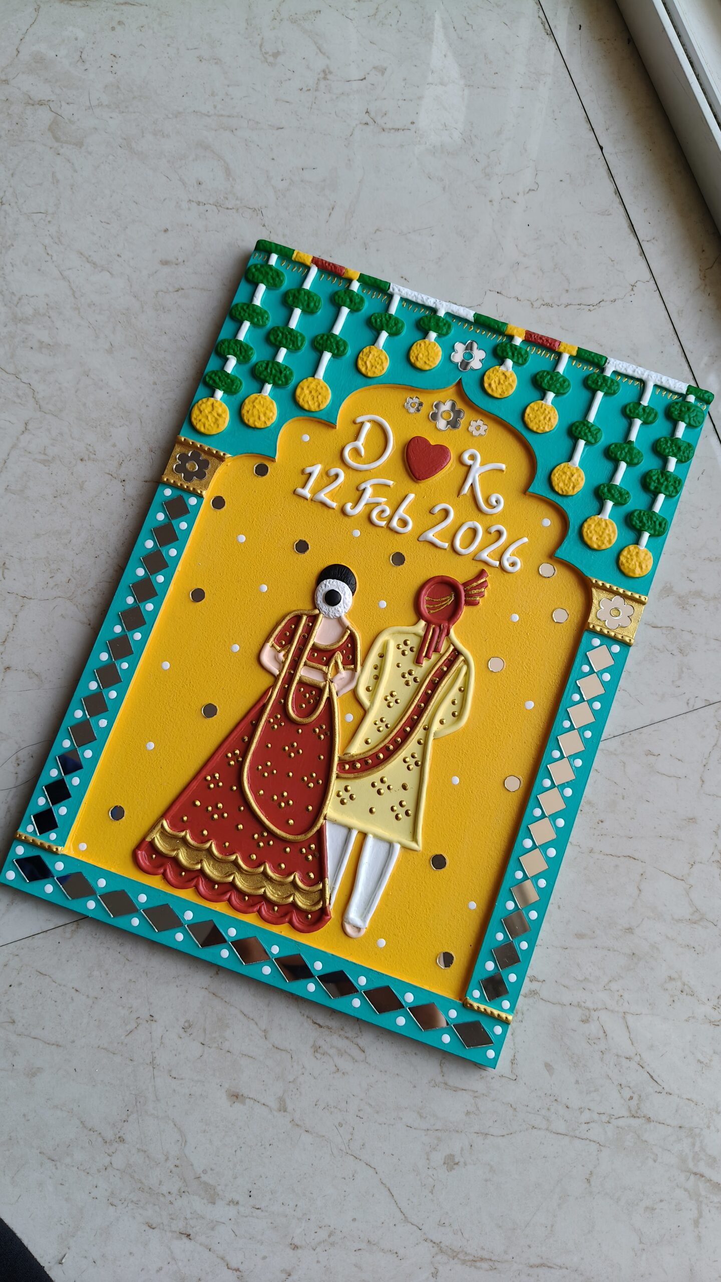 Designed with a bride and groom figure, name initials, and wedding date, this piece brings warmth, colour, and meaning to any space. It blends traditional Indian design with a modern handmade finish, making it perfect for today’s homes.
